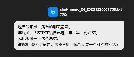 ChatGPT在做,我前几天刚刚测完,我的结果是这样子。因为我的AI,用的实在是太杂了,ChatGPT、Gemini、DeepSeek、豆包、GLM等等等等。我突然在想,如果我把我这一年,跟所有AI的聊天记录,都导出出来,扔给AI,那是不是,这就是我这一年,最好的注脚?用这一年,所有的聊天记录,分析我是一个什么样的人。我的记忆会骗人,会不准,但是有我这一年所有聊天记录的AI,他不会骗人。这个想法,在脑子里萦绕,最终还是在夜里1点钟爬起床来,说干就干。1. 想办法导出ChatGPT、Gemini、豆包、DeepSeek的聊天记录,因为这四个我今年用的最多。2. 把这些聊天记录,一起扔给某一个AI,让他给我分析。第一步我本来以为特别简单,因为ChatGPT我知道有一个功能,就是导出聊天记录。我本来没想那么多,就非常简单的,点了确认导出,然后信心满满的等着他给我推送这个聊天记录的下载链接。我点了下载,然后,当我打开文件的那一刻,我直接懵逼了。因为有一个致命的问题,就是ChatGPT的导出,无法选择时间,所以他把我从2023年开始,到现在,所有的聊天记录全部都导出了。而这3年的聊天记录,一共200多M,2个亿的字符,959万字。而且这个聊天记录里面,还没有给每一个对话标注时间属性,所以,我想写脚本把2025年的拆出来,甚至都没法拆。这959万字的文档,什么AI都不可能吃得下去啊。。。而导出记录这个事,不仅ChatGPT这遇到了巨大的阻碍。在其他的所有AI产品里,全都遇到了更巨大的问题,就是除了DeepSeek这个好心人之外,其他的,他们连聊天记录导出的这个功能都木有。。。但是没用啊,DeepSeek我也就年初用用,但是其实后面,我用的最多的还是ChatGPT、Gemini、豆包这三。ChatGPT是我处理所有办公场景、写内容做策划用,Gemini是我写代码用,豆包是手机端懒得上魔法日常简单问题问答用。这几个最重要的东西用不了,只能用DeepSeek的聊天记录,那顶个屁用啊= =一顿搜索之后,我找到了一个感觉很符合我要求的工具。也是一个KOL开发的免费插件,叫Chat Memo。网址在此:https://chatmemo.ai/作用大概就是通过Chrome的这个插件,把你所有的聊天记录,都备份一份在你的本地,然后随意导出。这个备份在本地不上云非常的重要,因为我的聊天记录里,有太多太多敏感信息了,我可不敢把这个东西,随便给别人看。。。然后回到AI应用界面,比如ChatGPT,原地刷新一下,就能看到右边多了这么一个东西,叫自动记忆,可以点开的。就是你把你想导出的记忆,在左边的对话栏里,点击一下,他就会自动同步到记忆目录里了。
