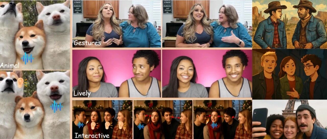 可扩展性:部分方法在训练阶段即为同一视频中的人物分配固定标记或路由顺序,因而难以突破"双人"的限制,生成超越两个身份的自然交互视频。 高训练成本:现有方法普遍依赖成本高昂的多人场景数据集开展训练;而多人场景因涵盖话轮转换、角色更替以及目光注视等非言语的复杂因素,导致数据采集与标注成本高。 缺乏交互性的定量评估方法:多人视频作为较新的领域,既往用于单人口型同步或视频质量的指标,难以充分衡量多人场景下的多个角色之间互动自然度。