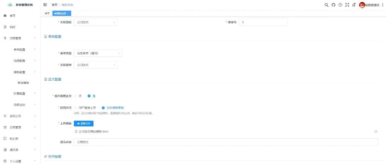 业务模块:个人事项(待办、已办)、流程管理、资讯公告、日程管理、知识库、通讯录、编号管理、运维管理; 系统配置:个人设置、基础设置; 内置功能:系统管理、系统监控、系统工具。