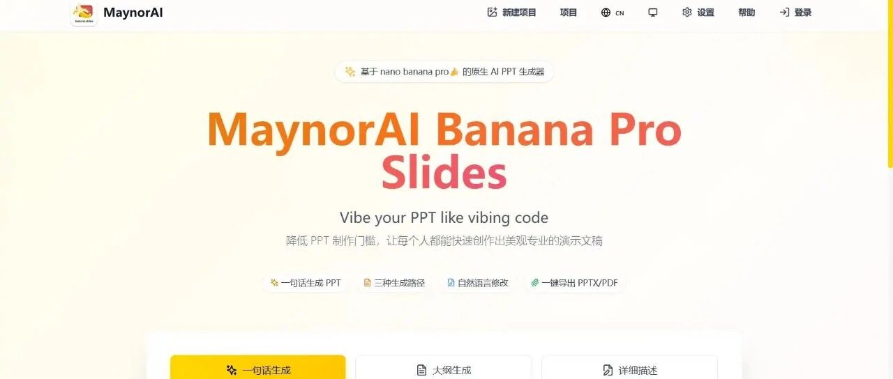 告别繁琐的排版与设计,让创意自由流动。基于 nano banana pro🍌 打造的原生 AIPPT 应用,让每个人都能轻松创作出专业且美观的演示文稿。