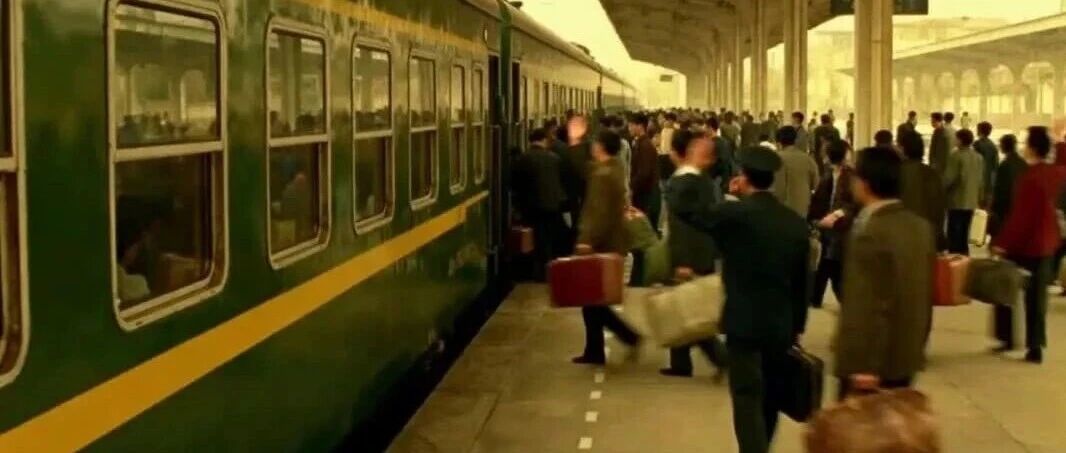 镜头最终推到火车车门处,停在车门打开的缝隙 + 一个正要挤上车的旅客的背影,结束。