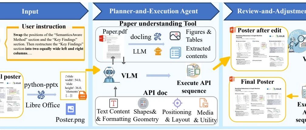 语义解析和元素序列化:将源海报 Psrc 解析为结构化的 JSON 数据 PJ src,提取所有元素属性以实现细粒度控制。 规划和执行:集中式智能体综合用户指令 I、视觉表示 PV src 和 JSON 数据 PJ src 生成执行计划。它还可以选择性地调用论文理解工具从论文 M 中提取内容,然后再调用多级 API 修改 .pptx 文件。 审核和调整:质量保证智能体将编辑后的视觉输出 PV edited 与原始 PV src 和用户指令 I 进行比较,重点验证修改后的元素,并通过额外的 API 调用进行调整,以确保视觉效果和指令的一致性。