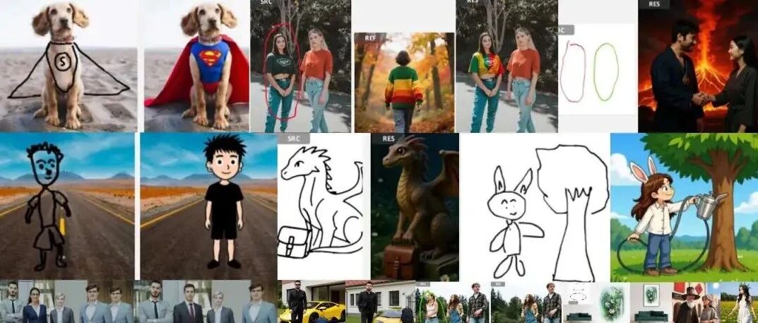 多模态数据合成:利用 Refseg 服务定位编辑对象,结合手绘标注、图像裁剪与草图生成技术构建数据集。 联合编码机制:对原始图像与草图图像使用相同的索引和位置编码,增强模型对草图区域的感知与对齐能力。 统一架构设计:兼容 RGB 图像输入,延续 DreamOmni2 的位置偏移与索引编码方案,支持多图像输入区分。 草图理解与编辑:通过颜色区分的草图输入,实现多区域、多类型编辑意图的联合理解与生成。