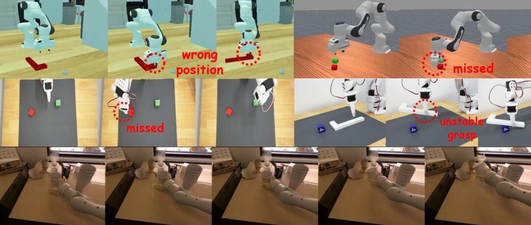 推理赋能长程规划:推理能力对于长程任务至关重要,实验证明 Fast-ThinkAct 在 LIBERO-Long 等长序列任务中表现尤为突出。 推理赋能失败恢复: RoboFAC 基准:Fast-ThinkAct 在模拟和真实数据上的得分分别比第二名高出 10.9 和 16.4 分。 定性分析:能够准确识别失败原因(如"抓取位置偏差")并提出具体的恢复计划(如"先退后,再对齐,最后抓取")。 推理赋能少样本适应: Few-shot 实验:在 RoboTwin2.0 上仅用 10 个演示进行微调,Fast-ThinkAct 在中等和长程任务上的表现均优于 和 ThinkAct,且延迟更低。 可言语化潜在推理的可视化: 对比显示,教师模型的文本推理虽然详细但包含冗余信息(橙色部分),而学生模型通过 Verbalizer 解码出的内容更加简洁、聚焦且准确(绿色部分),证明了蒸馏过程在压缩计算成本的同时也过滤了无效信息。 消融实验: 去除 或 均会导致性能下降,验证了偏好引导的语义对齐和视觉轨迹蒸馏的必要性。 单纯的 CoT-SFT 虽然有利于开放式 QA,但在结构化推理任务中因引入冗余信息而效果不佳,不如本文的蒸馏方法。