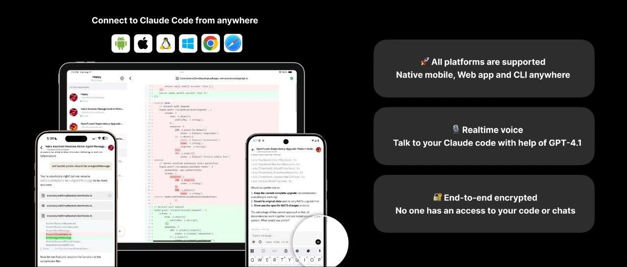 Happy Coder是一款开源工具,可将手机变为AI编程助手(如Claude Code)的远程监视器和遥控器。它支持端对端加密,确保代码安全,并允许用户在手机上实时查看任务进度、接收推送通知及远程确认需求,无需守在电脑前。安装简便,通过扫码即可连接手机与电脑。