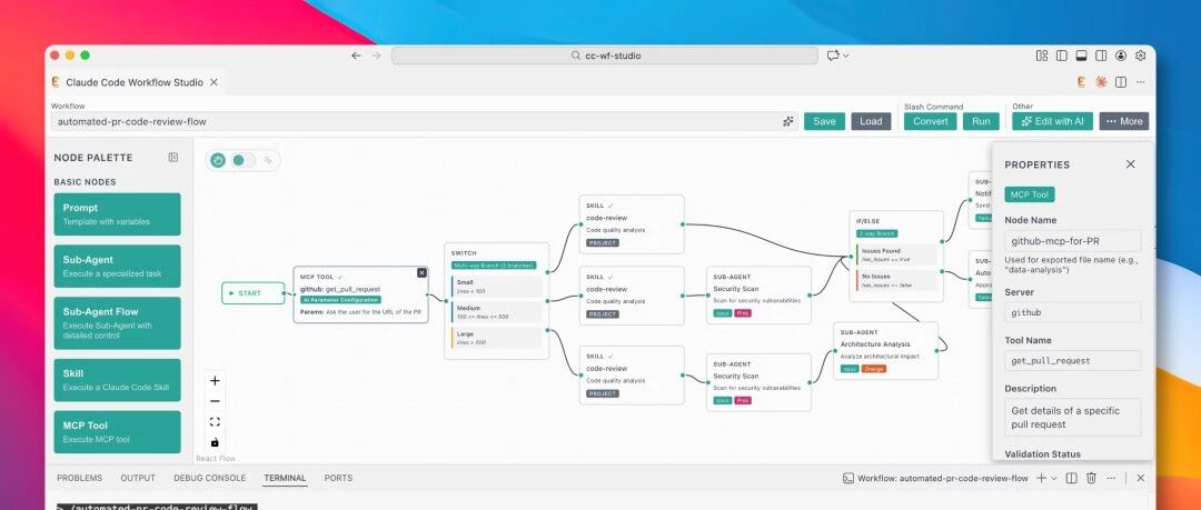我们只需像画流程图一样,拖拽连接提示词模板、子智能体、条件分支等节点,设计完成后即可一键导出为 .claude 格式文件,直接在 Claude Code 中运行。