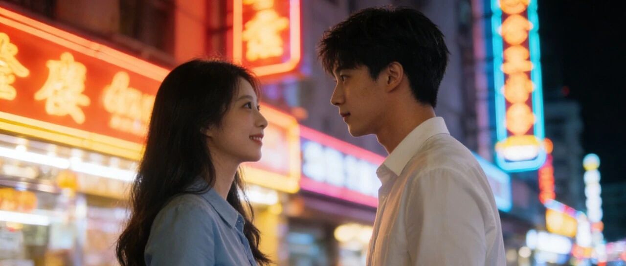 运镜:缓慢推近,从两人中景逐渐聚焦到女主角侧脸与男主角眼神。