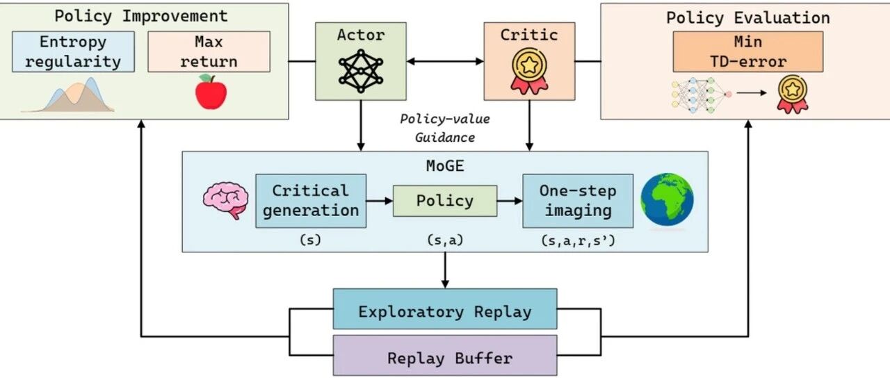 与其他框架不同,MoGE能够在不修改策略提升的前提下为算法持续提供关键训练样本,能够结合几乎所有的异策略(Off-policy)RL 算法(如 SAC, TD3, DSAC)中,主要包含两大核心组件 :