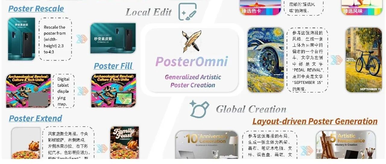在图像转海报的创意领域,如何高效融合局部精细编辑与全局概念设计,一直是创作者面临的挑战。PosterOmni这一创新框架的出现,正引领我们进入一个全新的艺术海报创作时代!通过任务蒸馏与统一奖励反馈机制,PosterOmni实现了从图像到海报的高效转换,无论是局部调整还是全局布局,都能轻松驾驭,让创意触手可及。