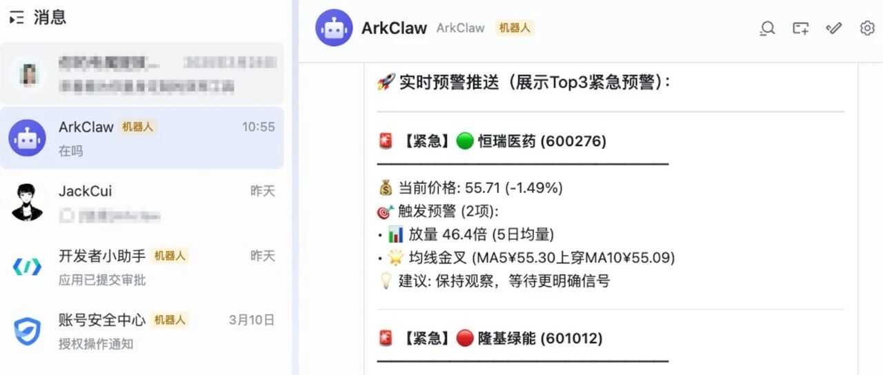 这个功能是我最满意的。因为 ArkClaw 是云端 7×24 运行的,哪怕你电脑关机了、手机锁屏了,盘中一有异动,飞书消息就弹过来了。