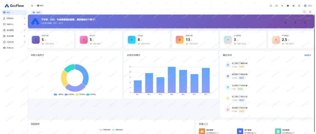 待办任务列表、已办任务追溯、审批历史记录。 流程实例监控(进度、耗时、瓶颈节点分析)。 - 数据可视化与统计