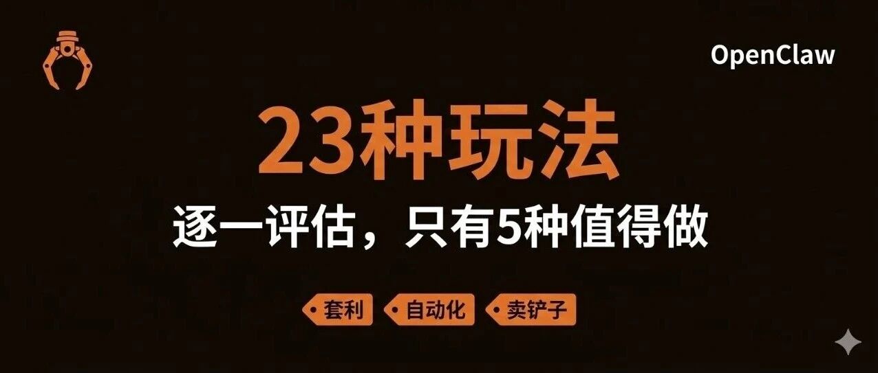 我花了两周时间,把 Twitter、知乎、36氪、GitHub 上所有关于 OpenClaw 赚钱的教程、案例、翻车现场都扒了一遍,整理出 23 种玩法,逐一评估真实价值。
