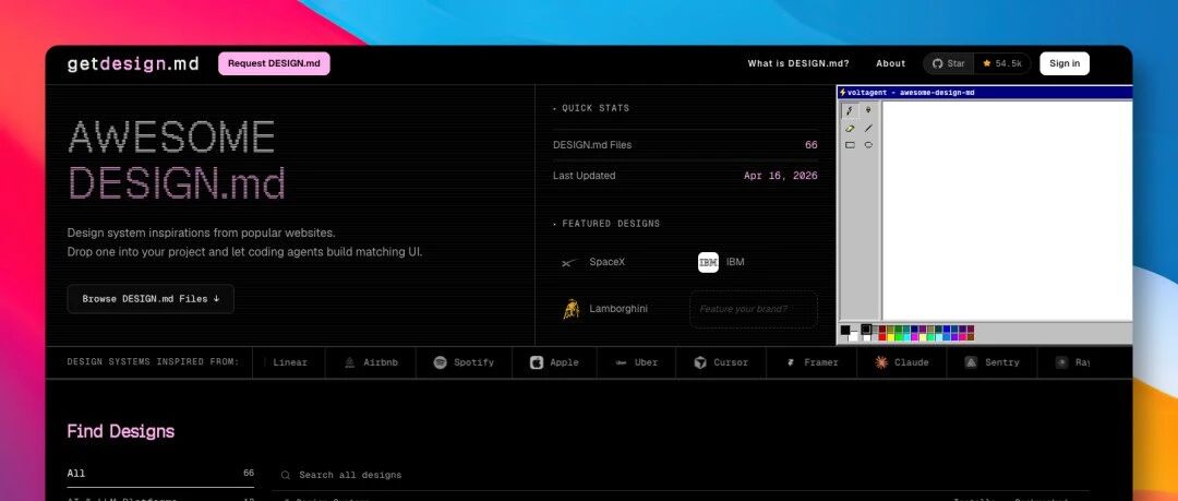 目前已参考 66 个顶级网站的视觉风格,提炼成了现成的 DESIGN.md 文件,可直接拿来就用。